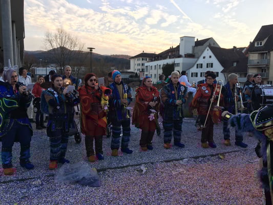 Der "Schmutzige Donnerstag" gilt für uns als Startschuss der Fasnacht. Spätestens wenn wir uns beim Brislacher Schulhaus für die Kinderfasnacht einreihen, kommt die Fasnachtsstimmung in vollen Zügen! Wie auch letztes Jahr nahmen wir gerne an diesem teil und marschierten mit den Kindern von Brislach durch das Dorf und wieder zurück zum Schulhaus, in welchem wir dann auf der Bühne einige Lieder "geschletzt" haben.