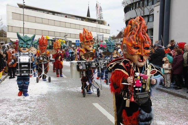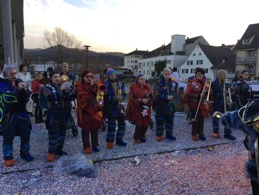 Am Abend ging es sogleich weiter: nach der Fütterungszeit im Restaurant Domino in Brislach machten wir uns auf den Weg nach Breitenbach, wo wir zusammen mit den Hirzefäger Breitenbach, Lady-Killers Laufen, Schnitzharmoniker Bärschwil und Donnerwäschpi Fehren am Sternemarsch teilnahmen.